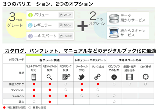 最上位の「エキスパート」は、これらに加え、ログ解析、ビデオ・音声組み込み、CD/DVDローカル再生の機能が装備されます。「エキスパート」におけるページ単価は、作成枚数に応じて変化し、最大で1,500円となります。