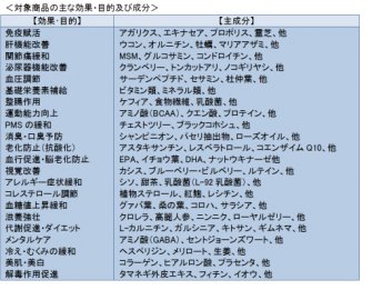 当資料では、サプリメントを「生活習慣病予防」「QOL(生活の質)向上」「美容効果」の3カテゴリーに分類。さらに、22種類の効果・目的別に分類し、ビタミン・ミネラル類やコラーゲン、グルコサミンなどの定番成分をはじめ、今後さらなる拡大が予想される注目成分についても実査。このように、サプリメント市場を多角的な視点から調査・分析を行うことで、サプリメント市場の全貌を明らかにしている。
