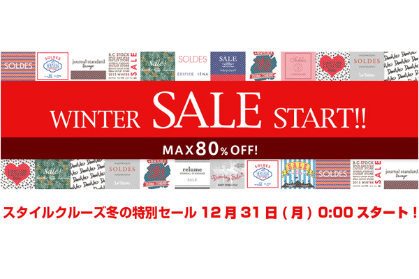 株式会社ベイクルーズ(東京都渋谷区、代表:窪田祐)が運営するファッション通販サイト「StyleCruise|スタイルクルーズ(http://style-cruise.jp/)」は、2012年12月31日(月)AM0時より冬のセール「Style Cruise 2013 WINTER SALE」を開催いたします。JOURNAL STANDARD、Spick and Span、IENA、EDIFICEなど人気ショップの冬の新作・定番アイテムなどが最大で80%OFFになります。この機会にぜひスタイルクルーズでのショッピングをお楽しみください。