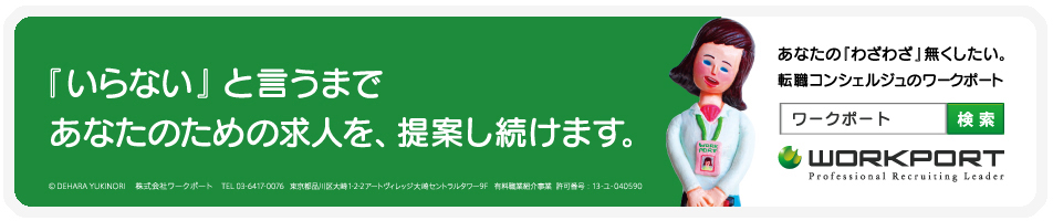 転職希望者の方は、限られた時間の中で「わざわざ」転職支援サービスを利用し、転職活動をされていると思います。その中で、紹介してもらえる案件が少ない、連絡がもらえない、など様々な御意見を拝見し、ワークポートでは「いらない」と言うまで求人を提案しつづけ、ホテルの「コンシェルジュ」のように転職活動を快適に進めて頂き、転職希望者の方をガッカリさせないサービスに努めております。