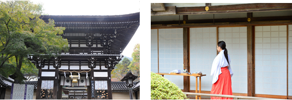 午前:松尾大社に集合、巫女装束に着替え、正式参拝(お祓い)、「篆書」手ほどき