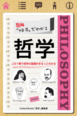 株式会社ユナイテッド・ブックス(本社:東京都新宿区、取締役社長 神澤享裕 http://www.unitedbooks.co.jp)は、2012年12月13日にリリースしたiPhoneアプリ『図解 40字でわかる 哲学』を年始キャンペーンとして1/11まで85円(通常価格800円)で提供いたします。