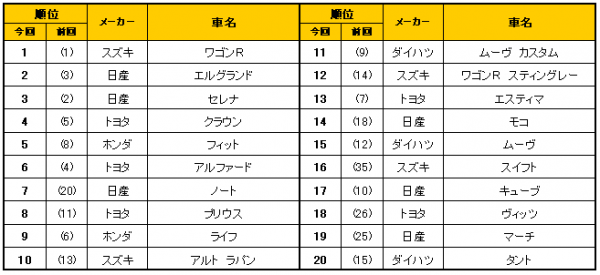 2位にエルグランドが、3位にセレナがランクインし、トップ3では2位と3位が入れ替わる形となりました。