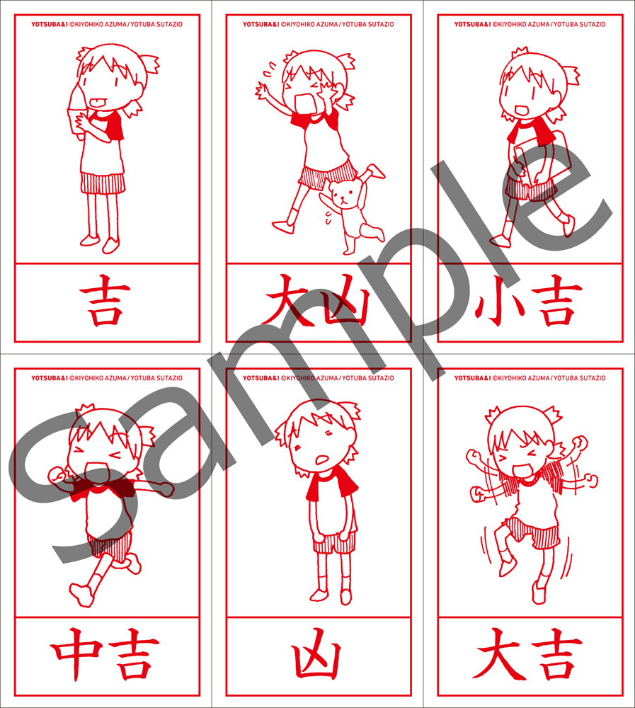 期間中よつばとグッズお買い上げ1会計ごとに、新春祈願「特製よつばと!おみくじ」がひけます。おみくじの絵柄は「大吉」、「中吉」、「小吉」、「吉」、「凶」、「大凶」の全6種類。万一「大凶」をひいてしまったお客様には神主ダンボーによる厄払いがございます。さらに期間中よつばとグッズ1,200円以上ご購入のお客様には、神主ダンボーとツーショット撮影も可能です。スタッフがシャッターを押しますのでカメラをご持参のうえご来店ください。おみくじは無くなり次第終了となります。