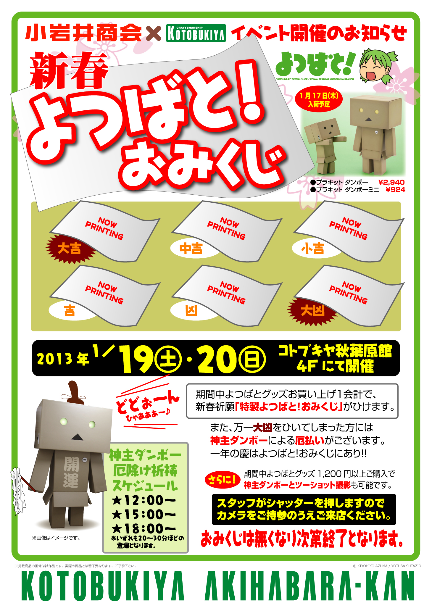 ホビーメーカーコトブキヤ(本社:東京都立川市曙町/ 代表:清水 一行)は2013年1月19日(土)20日(日)の2日間、コトブキヤ秋葉原館(東京都千代田区外神田1-8-8)にて「よつばと!おみくじイベント」を開催致します。