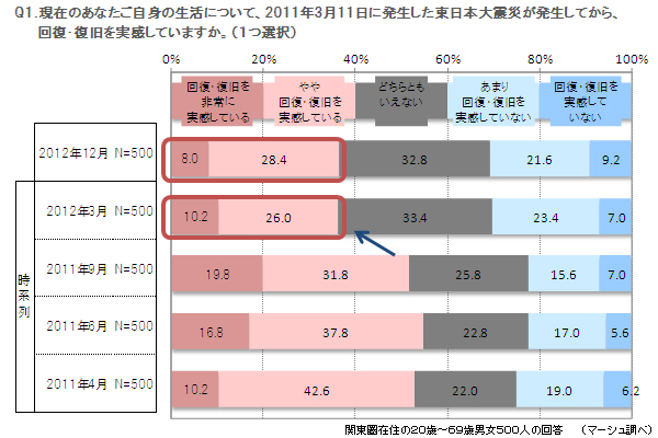 Q1.現在のあなたご自身の生活について、2011年3月11日に発生した東日本大震災が発生してから、回復・復旧を実感していますか。(1つ選択)
