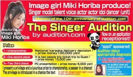 オーディションドットコムイメージガール英語版開催、歌手、モデル、声優、アイドルのオーディション募集。世界共通語の英語版で世界中から日本に応募が出来るようになりました。オーディション応募があれば、オーディションドットコムの提携先を安心して紹介するシステムです。今、アメリカ、カナダ、ヨーロッパ、ハリウッド、ブロードウェイ、台湾、香港、韓国、ベトナム、タイ、インドネシア、ブラジル、中国などのオーディション募集。3か月おきに歌手オーディションを新しく更新していきます。