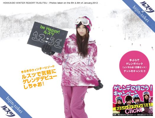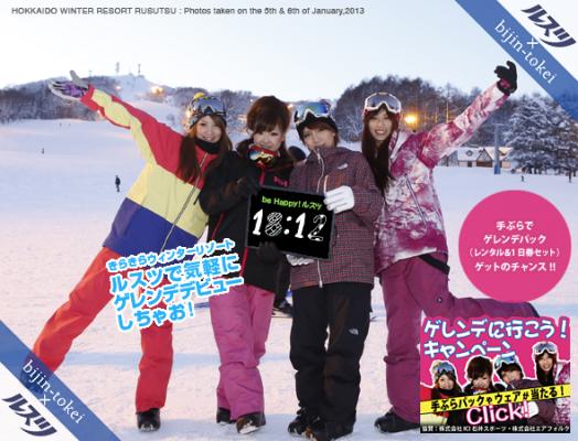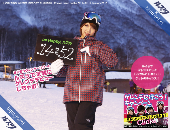 1月5日・6日の2日にわたり、約250名が参加したルスツリゾートゲレンデ内での「be Happy!ルスツ×美人時計」をテーマとした一般撮影会での撮影画像を1月21日より美人時計北海道サイト、及びルスツリゾートFacebookページにて一斉公開すると共に、撮影会当日、美人時計モデルたちが身に着けた最新ウエアやレンタルフルセット・1日券などが当たる特設サイトでのキャンペーンをPRしていきます。美人時計北海道サイトでの公開時間は、11:08~11:15、12:48~12:55、13:48~13:55、14:48~14:55、15:12~15:19、16:24~16:27、17:12~17:19、18:12~18:19の計60分(1カ月間)。ルスツリゾートFacebookページでは、毎回違った美人時計モデルたちがゲレンデを実際に体験するリポート記事も定期的に公開中です。