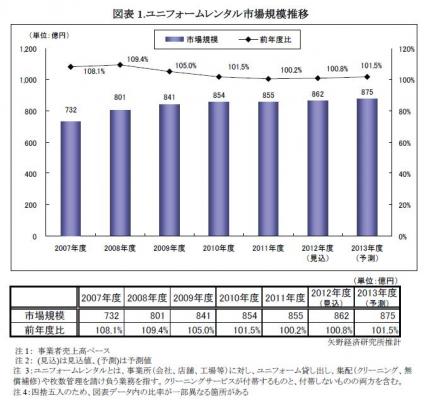 本調査におけるユニフォームレンタルとは、事業所(会社、店舗、工場等)に対し、ユニフォーム貸し出し、集配(クリーニング、無償補修)や枚数管理を請け負う業務を指す。同サービスには貸し出しに際し、クリーニングサービスが付帯したものと、付帯しないものがあるが、本調査ではその両方を含んでいる。