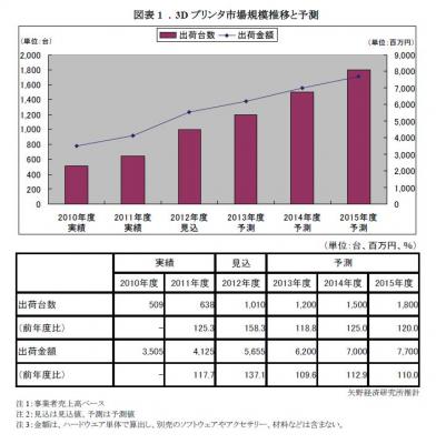 3Dプリンタの主な需要分野としては、デザイン検討、機能検証等に利用する工業・研究系用途、建物の模型等に利用する建築系用途、歯科模型、人体模型、福祉機器模型等に利用する医療・福祉系用途、モノづくり教育のツール等として利用する教育系用途などがある。