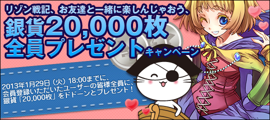 リゾン戦記をプレイしていると、【武器の強化】や【レベルアップ】といたるところで必要になる『銀貨』。この『銀貨』を、2013年1月29日(火)18:00までに、会員登録いただいたユーザーの皆様全員に、「20,000枚」をドドーンとプレゼント。この機会に『銀貨』を入手してリゾン戦記を楽しんでくださいね。
