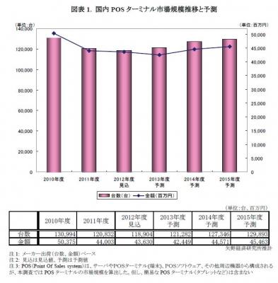 POSとは、販売時点売上管理システムともいわれ、物品販売の売上実績を単品で管理し集計するシステムをさす。システムは、サーバやPOSターミナル(端末)、POSソフトウェア、その他周辺機器から構成されるが、本調査ではPOSターミナルの市場規模を算出した。但し、簡易なPOSターミナル(タブレットなど)は含まない。