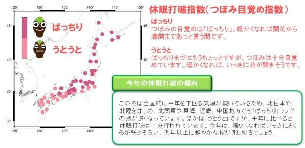 LBWの分析では「休眠打破は一日の平均気温が10度を下回る頃から行われている地域が多いこと、また、春先の気温に対する感度は福島県以北で一段とよく、つぼみの成長も早い」ということが分かっています。
