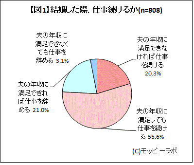 全国の20代・30代の働く独身女性に対して、「独身女性キャリア意識調査」についてスマートフォンリサーチを実施した。「仮に結婚した際、仕事を続けますか」という質問に対して、全体で最も多く選択されたのは「夫の年収に満足しても仕事を続ける」(55.6%)であった。一方、「夫の年収に満足できれば仕事を辞める」(21.0%)、「夫の年収に満足できなくても仕事を辞める」(3.1%)と、結婚のタイミングで仕事を辞めたいという意思を示した人は全体の24.1%にとどまり、寿退職を夢見る人は少数派であると言えそうだ。