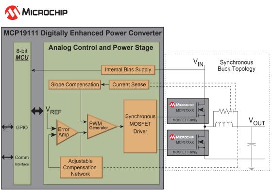 マイコン内蔵アナログ電源コントローラ ファミリであるMCP19111は、4.5~32 Vの幅広い電圧レンジで動作し、従来のアナログベースのソリューションと比べて極めて高い柔軟性を誇ります。MCP19111は、アナログベースのPWMコントローラとFlashベースのマイコンを統合した、世界初のハイブリッド、ミクストシグナル電源コントローラです。この統合によりアナログベースのコントローラの速度、性能、分解能はそのままに、デジタル ソリューションの柔軟性を実現しました。MCP19111は最大32 Vの動作をサポートし、同期降圧アプリケーション用に構成されたMOSFETドライバを内蔵しています。マイクロチップ社の新しい高速MOSFETファミリと組み合わせる事で、MCP19111は高効率の電力変換を実現します。