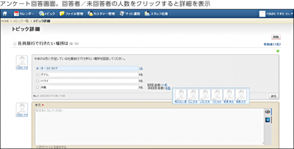 「簡易アンケート機能」は、トピック(※1)で作成するメッセージに、択一か複数選択で回答するセレクト形式のアンケートを設定できる機能です。作成者はアンケート設定画面で選択肢を作るだけで簡単に確認やアンケートの設定ができ、トピック参加者は、選んで返信ボタンを押すだけで回答できます。トピックで、回答者数、未回答者数、各選択肢の選択者数が一目でわかり、人数をクリックすることでメンバー一覧詳細の表示も可能です。