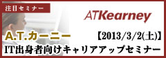 A.T. カーニーは、IT業界ご出身で今後経営コンサルタントへのキャリアアップを目指される方々を対象とした会社説明会を下記のとおり実施いたします。