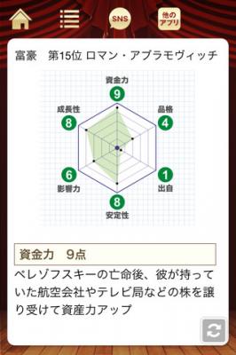 ・レーダーチャートによる実力分析で視覚的に各富豪の実力がわかるよう心がけました。