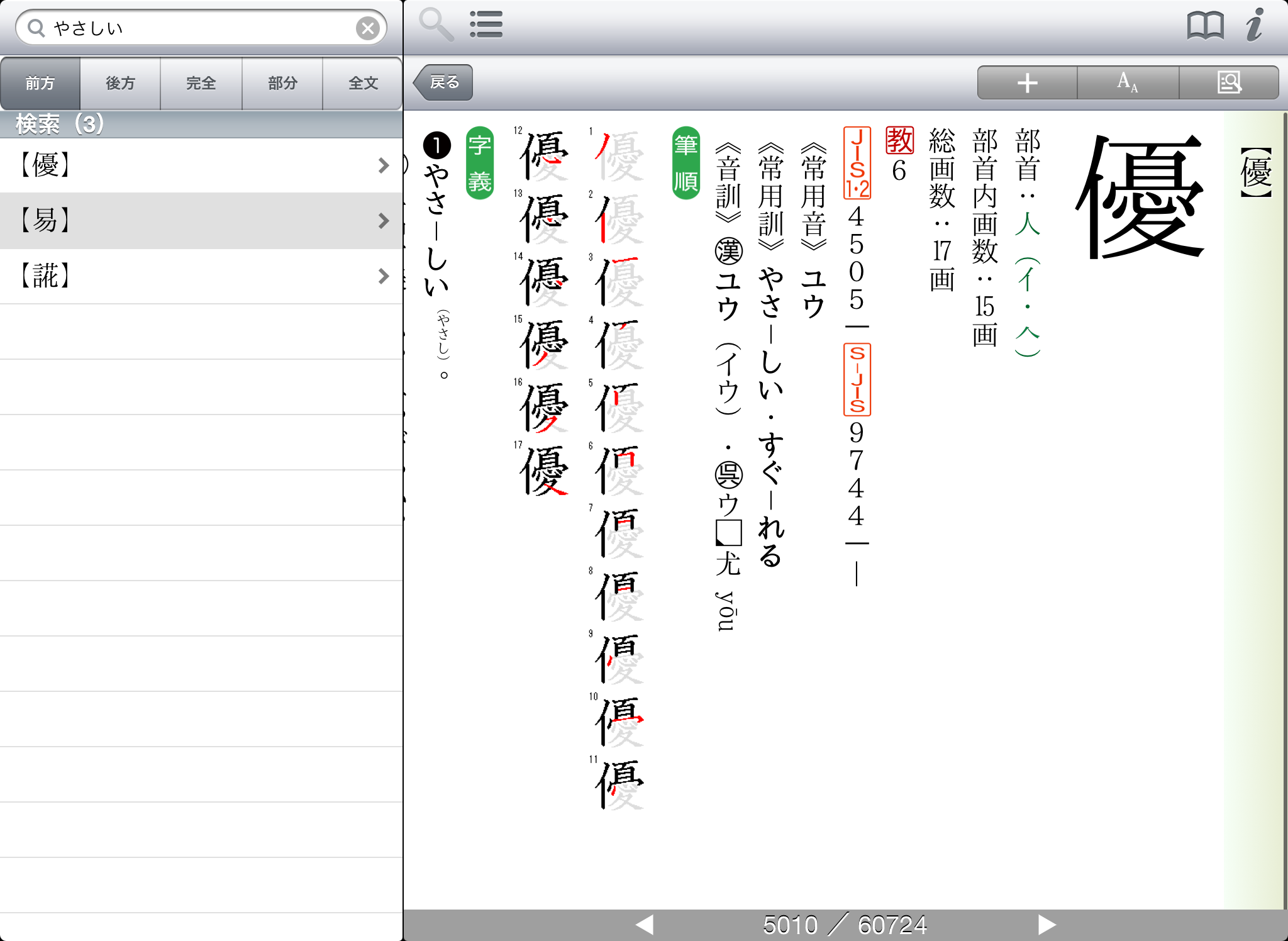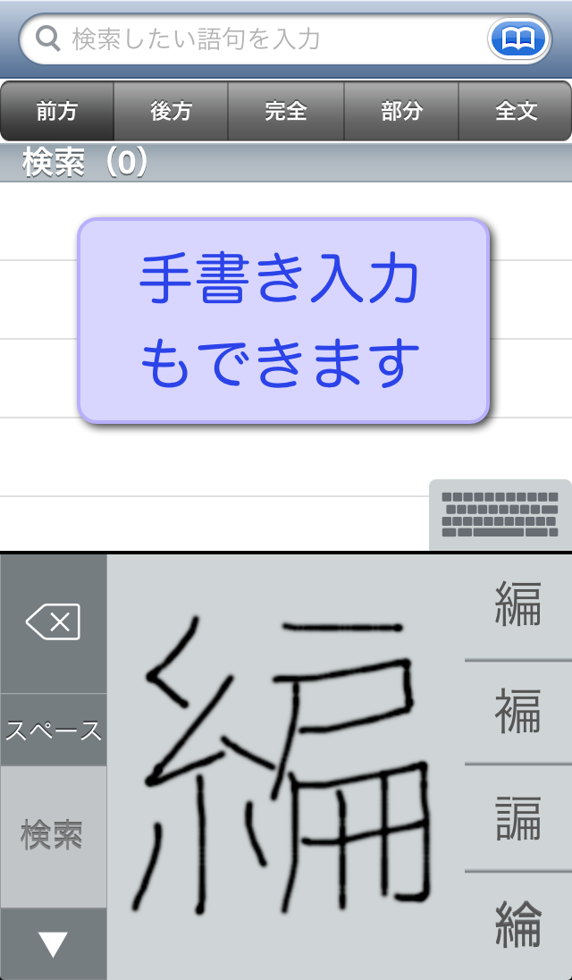 ● 豊富な検索オプションを用意(前方一致検索・後方一致検索・完全一致検索・部分一致検索・全文検)。それぞれの検索方法で、文字を入力すると候補見出し語が表示されるインクリメンタルサーチに対応。(部分一致、全文検索を除く)用語をうろ覚えでも検索が容易です。