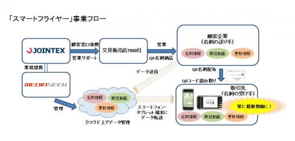 プラス株式会社(東京都港区 代表取締役社長 今泉公二)の社内カンパニーであるジョインテックスカンパニー(カンパニープレジデント/常務取締役 淺野紀美夫)は、携帯電話を主としたソフトウェア開発の株式会社 メディアシーク(東京都港区 代表取締役 西尾直紀 証券コード:4824)と共同で、QRコード入り名刺とスマホアプリを連動し、「販促情報の提供」に加えて、「名刺情報のスマホへの送信」や「名刺情報の更新機能」を実現したQRコード入り名刺「スマートフライヤー」を開発し、ジョインテックスが提携する全国の文具販売店で2013年2月4日から発売いたしました。