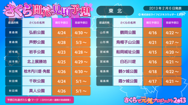 本日6日より、さくらで元気パートナー様へ向けて、さくら開花・見頃予想の画像・データ配信を開始致しました。今年は、さくら情報に加え「お天気画像」の配信も行っております。引き続き、弊社のさくら情報・お天気画像を用いて、ともに「東北復興の祈りと元気」を届けてくれる「さくらで元気パートナー」様を募集しております。さくらで元気プロジェクト特設サイトより、是非ご登録下さい。