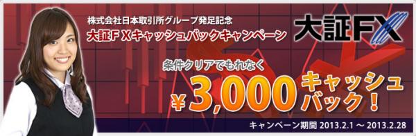 内 容 :期間中、大証FXの売買枚数が50枚以上のお客様にもれなく『3,000円』をキャッシュバックさせていただきます。