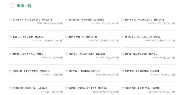 「あなたのKissを川柳にのせて・・・」と題したキャンペーンサイトでは、2月1日より集まった川柳全作品の掲載を開始しました。すでに約400件の川柳が掲載され、たくさんの人のKissの思い出やエピソード、さらには大切な人へ届けたい想いであふれています。