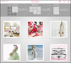 【Bridea】は「イメージする」「整理する」「伝える」をコンセプトの基本とした、直感的でシンプルなサービスです。理想の結婚式をイメージ画像でまとめて、スクラップブックのようにお使いいただくことができます。