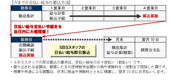 そこでSBSスタッフは、銀行との交渉を進めるとともに、給与計算システム、全営業所における出勤確定作業やデータ集計を全面変更することで、午前10時までの勤務開始であれば、当日働いた分の給与をその日にお支払いする即日振込を可能にいたしました。
