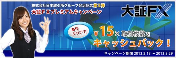 内容:期間中、大証FXの月間売買枚数が3,000枚以上のお客様に「売買枚数×15円」をキャッシュバックさせていただきます。