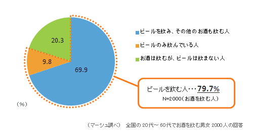 お酒を飲む人のうち、約8割の人がビールを飲んでおり、