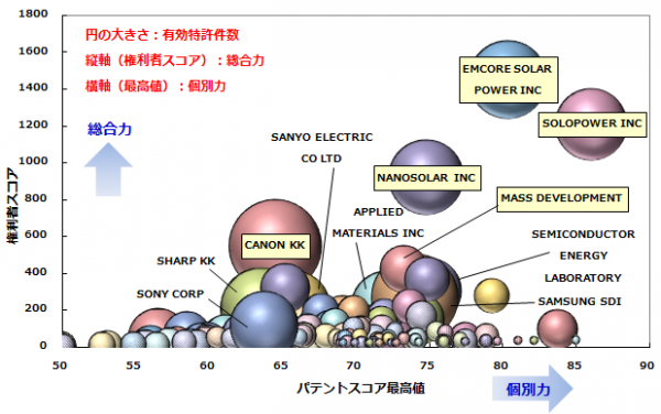 株式会社パテント・リザルトは2013年2月15日、2013年1月から欧米にて本格運用が始まった「共同特許分類(CPC)」を用い、米国における太陽電池セル分野について、参入企業の競争力に関する調査をまとめました。1980年から2012年12月末までに米国特許商標庁で公開された太陽電池セル分野として、CPC「Y02E10/541(CIS薄膜系太陽電池)」~「Y02E10/549(有機材料太陽電池)」が付与された特許4,510件を対象に、個別特許の注目度を得点化する「パテントスコア」による評価を実施し、特許の質と量から総合的に見た「特許総合力ランキング」を集計しました。