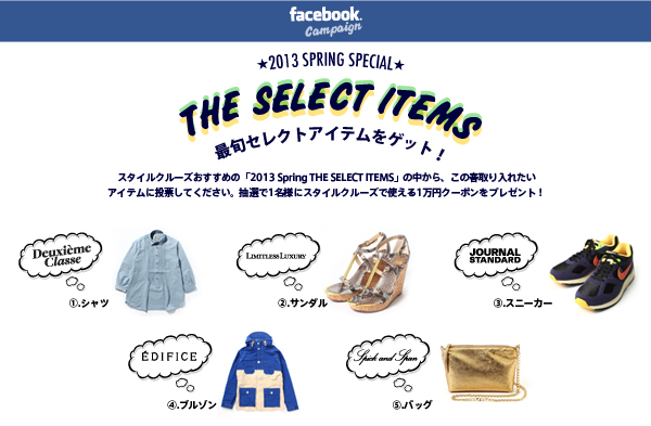 「2013 Spring THE SELECT ITEMS」facebookキャンペーン http://present.crocos.jp/38256