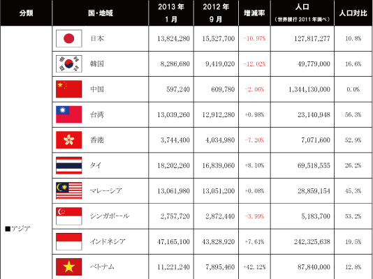 ※イランは2012年2月が最新データとなるため2013年1月、2012年9月ともに同数値を記載