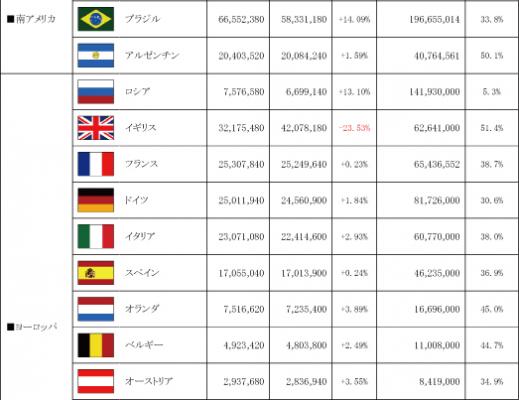 前回発表した2012年9月の数値※と比較すると、ベトナムでは前回比+42.12%と40ヶ国中で一番の伸びを見せている一方、イギリスでは前回比-23.53%となり、2割以上も大きく減少、フェイスブック大国のアメリカでも2%微減し、フェイスブック離れが見られます。また、前回2012年9月時点での前回比マイナスは、40ヶ国中1ヶ国のみだったのに対し、今回の調査では、40ヶ国中13ヶ国が前回比マイナスとなり、フェイスブック人口の頭打ちが顕著に表れています。以下、世界40ヶ国のフェイスブック人口推移です。