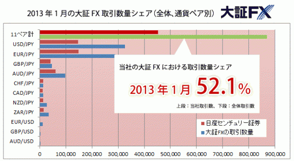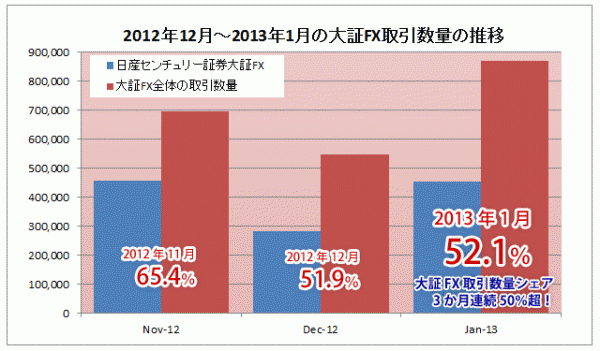 この度、日産センチュリー証券では大阪証券取引所に上場されている外国為替証拠金取引(大証FX)において、2012年11月、12月度に続き2013年1月度の取引シェアが50%超(※)となりました。