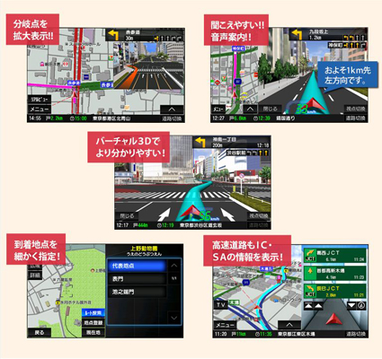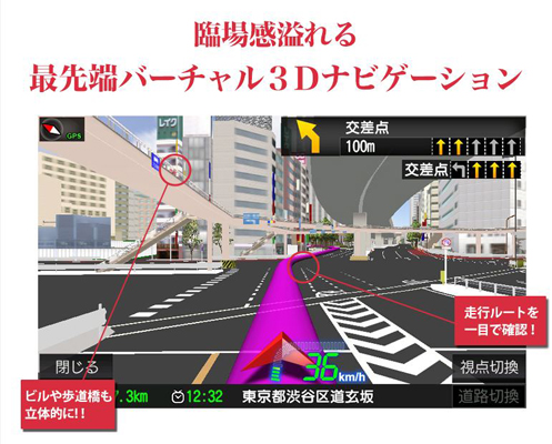 最先端技術「バーチャル3D」を搭載した当商品は、ナビゲーションシステムに全国20都市のリアルな街並みを再現。