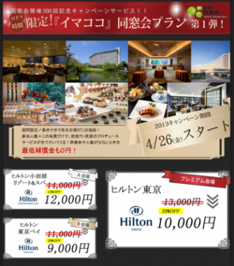 会場の閑散期を有効活用し、会場の埋まりにくい「季節」「時間」「日取り」を有効活用し、安価で同窓会に提供するサービスです。お盆期間の閑散期や、仏滅などの日取りが悪い日を対象となります。会場は遊休施設を有効に活用する事で、人件費や食材のロスをなくす事が可能となります。第一弾は外資系ホテルヒルトングループが参加しており、個人では利用出来ない価格でのプランとなっています。