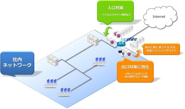 このため、仮に個々のPCのアンチウイルスが機能しない状況(新種のウィルスやパターンファイルの更新が行われていないといった状況)でも、BotBlockerが最終的な情報流出の出口にて漏えいを防ぎます。