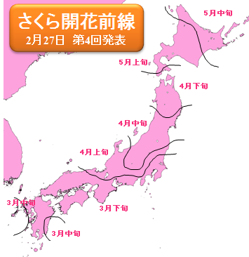 3月に入ると春らしい日が増え、寒い日が多かった昨年に比べ、東北南部から西のさくらの開花は5日前後早い所が多いでしょう。全国トップの開花は宮崎で3月19日、東京(標本木)は3月26日、上野恩賜公園は3月25日の予想に。さくら前線が東北入りするのは、福島県いわき市で開花する4月7日。今回から発表となった北海道は、函館で2009年以来、4年ぶりに4月中の開花となるでしょう。