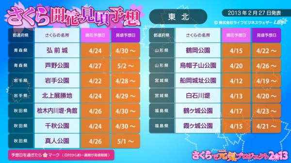 引き続き、さくらで元気プロジェクト2013に賛同して頂ける各種メディア・CP(コンテンツプロバイダー)・企業・個人開発者様を“さくらで元気パートナー”と称し、広く募集しています。さくらで元気パートナーにご登録頂くと(無料)、さくら情報のデータ(CSV形式)や画像、お天気画像を無償でご利用頂けます。ぜひ、特設サイトよりご登録下さい。【特設サイト】http://tenki.lbw.jp/sakura2013/