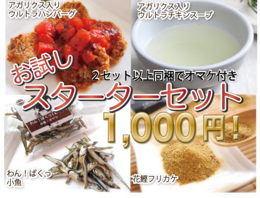 商品内容:アガリクス入りハンバーグ(4個入り)、アガリクス入りチキンスープ、わんぱくっ小魚、花鰹ふりかけ