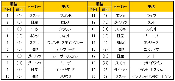 2月のランキングでは、トップ3は先月と変わらず。1位ワゴンR、2位セレナ、3位クラウンとなっています。