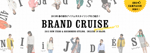 “BRAND CRUISE”特集では、ベイクルーズグループの各ブランドより、2013年春夏のテーマとともに、今季おすすめのスタイリング提案や、ピックアップアイテムをご紹介。今すぐに取り入れたい着こなしや、マスト・ハブなアイテムをご覧いただきながら、最旬アイテムのお買いものをお楽しみいただけます。