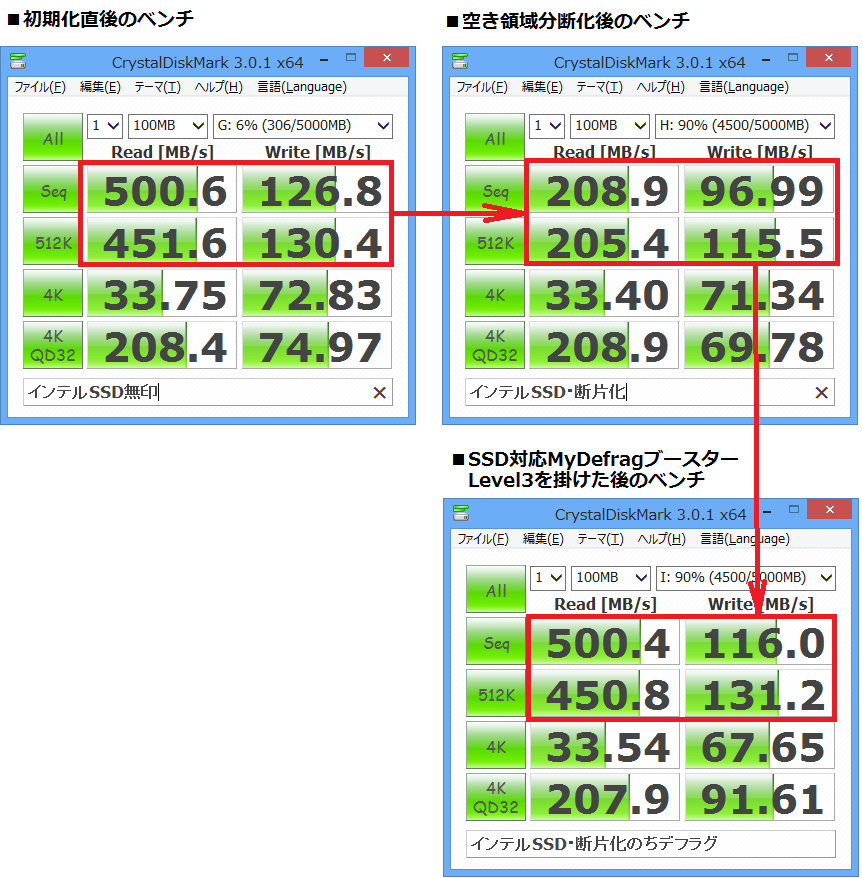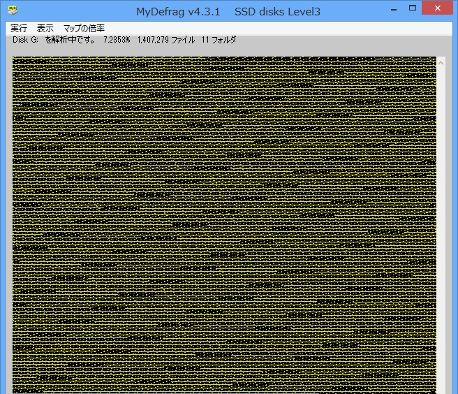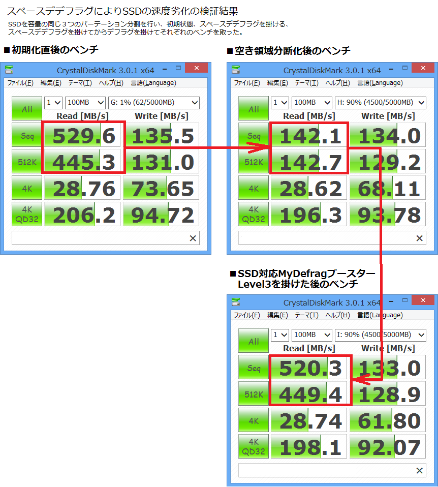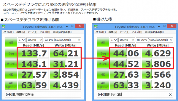 「スペースデデフラグ」を使用し、比較的旧いSSDに掛けた時、実に性能が1/13への性能劣化を確認しました。