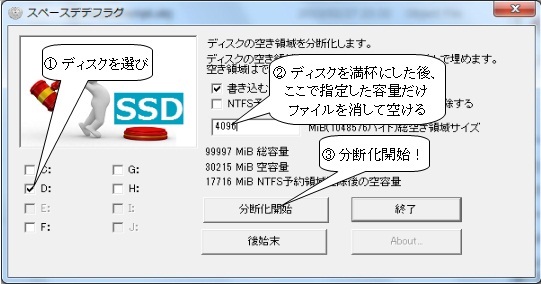 本ソフトはSSDの空き領域を可能な限り分断化します。次の手順を踏み、不整合を作り出します。