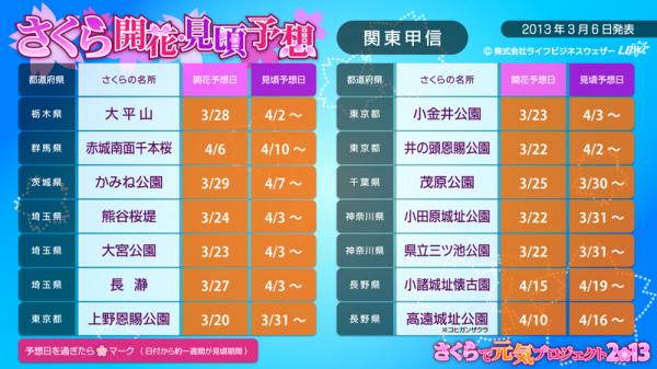 引き続き、さくらで元気プロジェクト2013に賛同して頂ける各種メディア・CP(コンテンツプロバイダー)・企業・個人開発者様を“さくらで元気パートナー”と称し、広く募集しています。さくらで元気パートナーにご登録頂くと(無料)、さくら情報のデータ(CSV形式)や画像、お天気画像を無償でご利用頂けます。ぜひ、特設サイトよりご登録下さい。【特設サイト】http://tenki.lbw.jp/sakura2013/