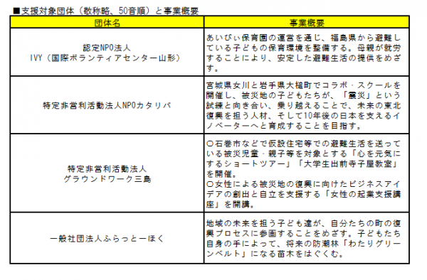4団体に対する助成金による支援を行なうほか、フヨウサキナ関係スタッフによる被災地におけるボランティア活動を支援してまいります。支援総額は1500万円を予定しております。