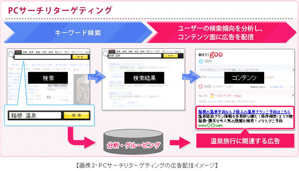「PCサーチリターゲティング」は、リスティング広告「レモーラリスティング」(※1)に追加される配信オプションの一つで、クロスリスティングが提携するgoo等の国内大手ポータルサイトを中心としたPC向け優良コンテンツ面へ、ユーザーの検索傾向をベースにしたターゲティング広告を配信するサービスです。(※画像1・2参照)