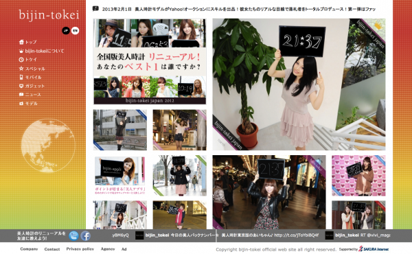 美人時計(美人時計)は、2009年、「美人時計であなたは1分間の恋をする」 をコンセプトにして生まれた、手書きのボードを持った360人の「美人」による、1440枚(分)の時計です。時計という日常的に必要とされるツールを、全国各地の「美人」が楽しく届けます。美人時計が考える「美人」とは、容姿だけではなく、アクティブでありながら周囲に元気を与える人だと考えます。